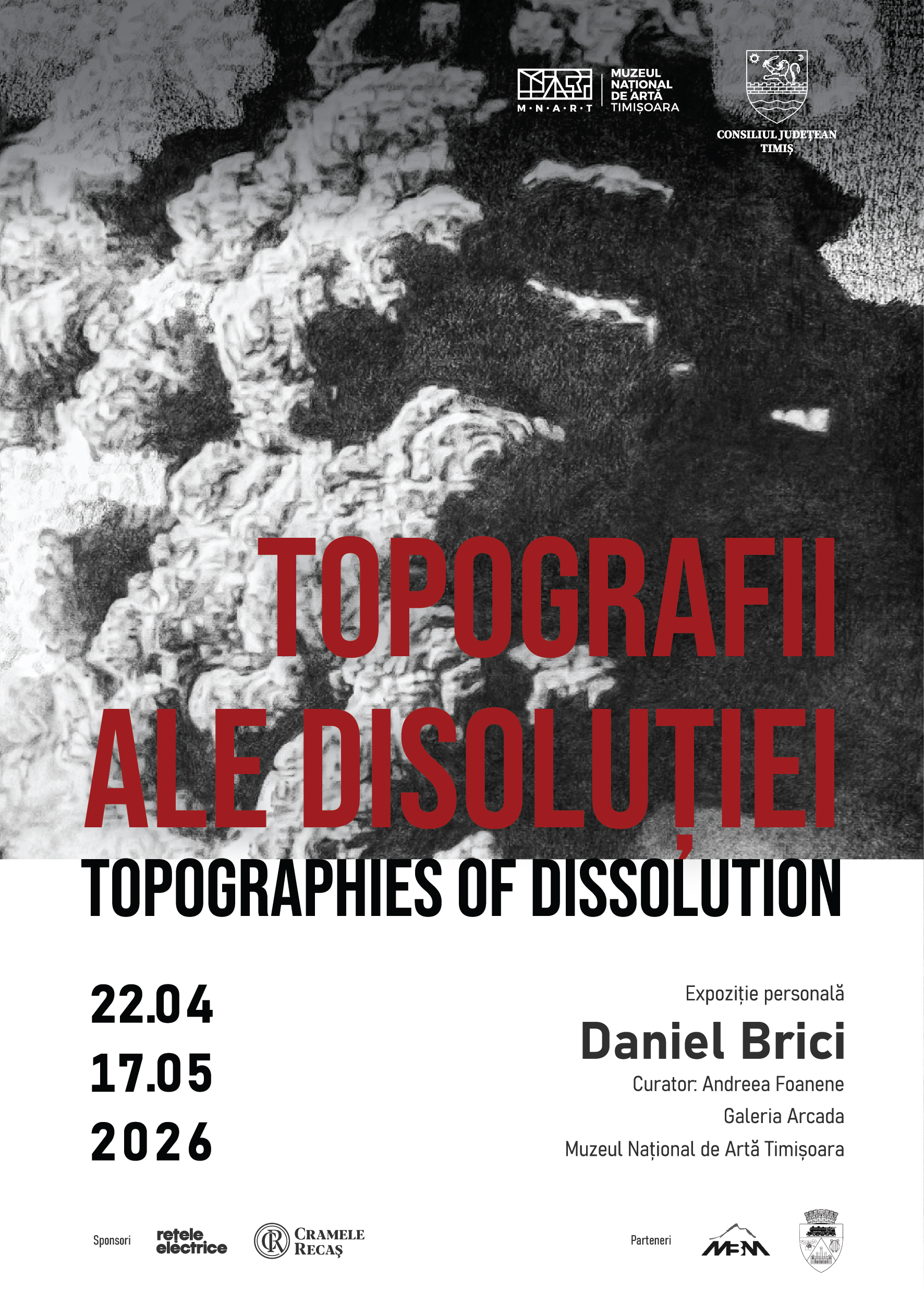 Muzeul Național de Artă Timișoara și Consiliul Județean Timiș au plăcerea de a vă invita, miercuri, 22 aprilie, ora 18.00, în Galeria Arcada, la deschiderea expoziției personale a artistului Daniel Brici, intitulată „Topografii ale disoluției / Topographies of Dissolution”, un proiect vizual de mare intensitate care investighează memoria, materia și fragilitatea lumii contemporane prin intermediul desenului hiperrealist.